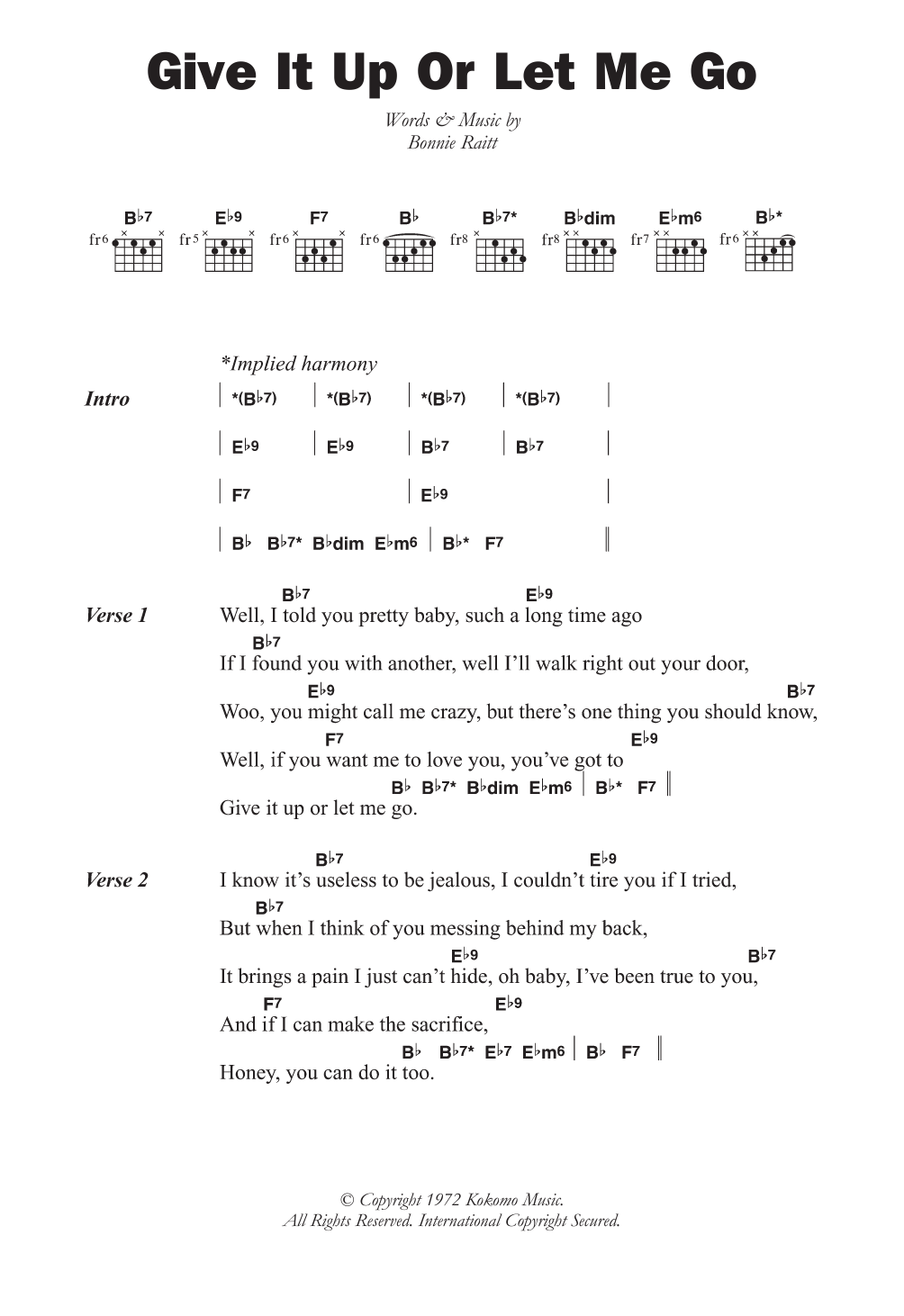 Download or print Bonnie Raitt Give It Up Or Let Me Go sheet music, chords and digital score arranged for Guitar Chords/Lyrics. This Country score includes 2 page(s).
