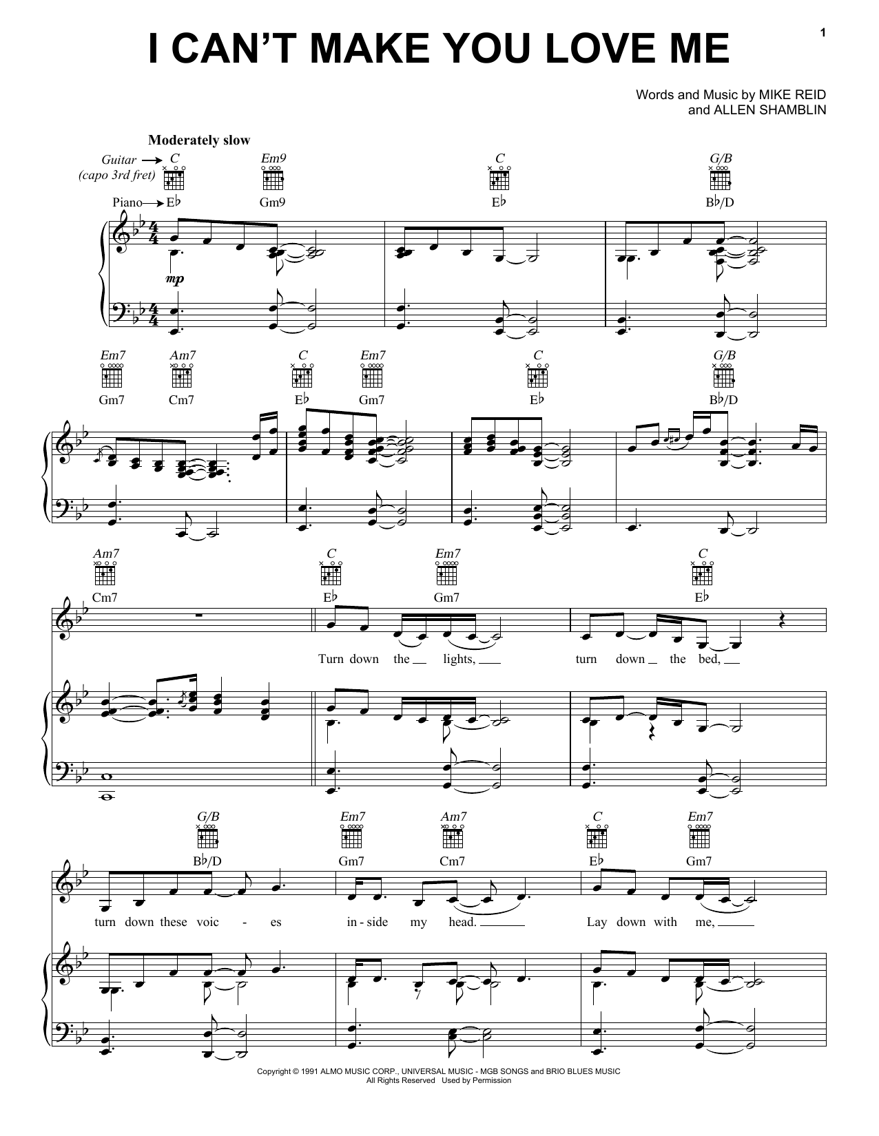 Download or print Bonnie Raitt I Can't Make You Love Me sheet music, chords and digital score arranged for Piano, Vocal & Guitar Chords (Right-Hand Melody). This Love score includes 7 page(s).