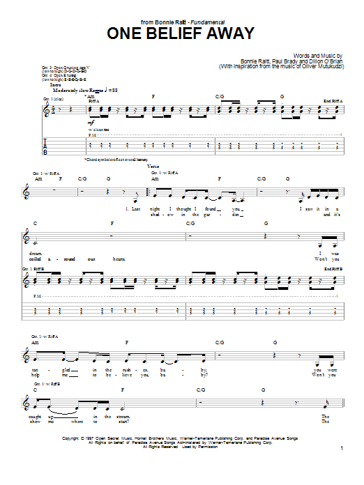 Download or print Bonnie Raitt One Belief Away sheet music, chords and digital score arranged for Guitar Tab. This Pop score includes 7 page(s).