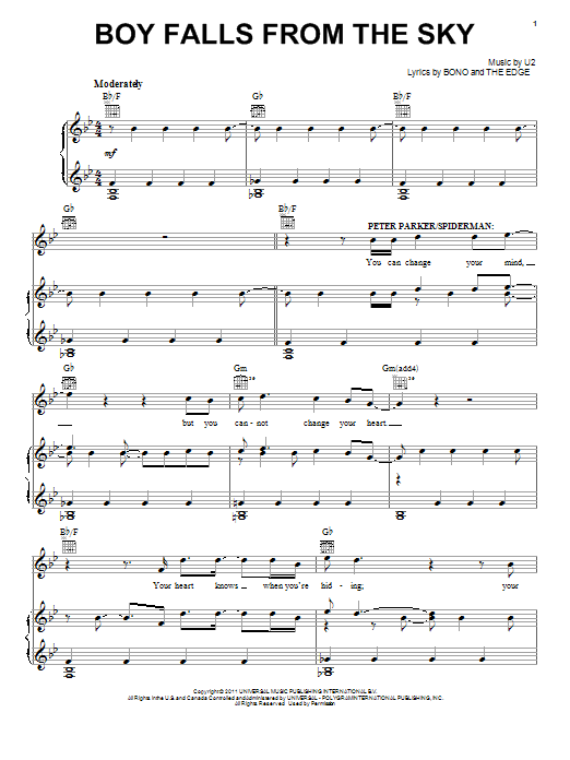 Download or print Bono & The Edge Boy Falls From The Sky sheet music, chords and digital score arranged for Piano, Vocal & Guitar Chords (Right-Hand Melody). This Pop score includes 11 page(s).