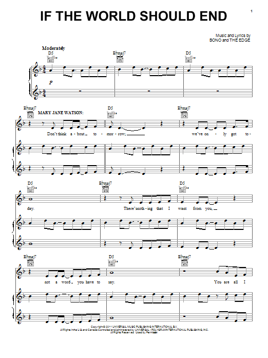 Download or print Bono & The Edge If The World Should End sheet music, chords and digital score arranged for Piano & Vocal. This Musical/Show score includes 7 page(s).