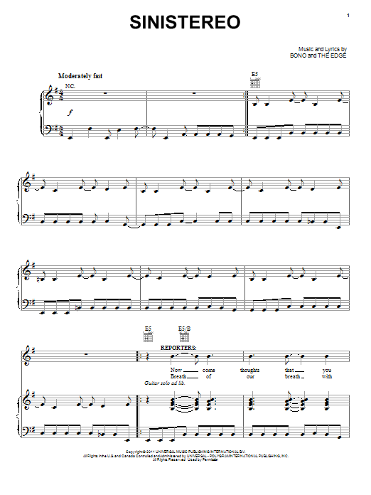 Download or print Bono & The Edge Sinistereo sheet music, chords and digital score arranged for Piano, Vocal & Guitar Chords (Right-Hand Melody). This Pop score includes 4 page(s).