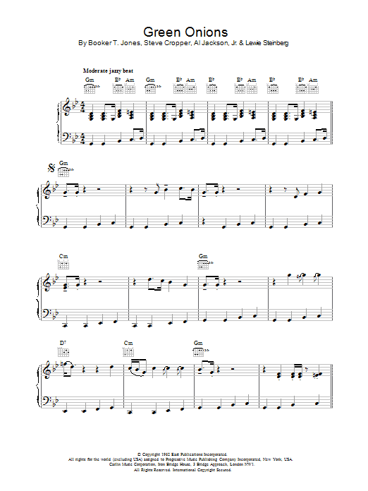 Download or print Booker T. & The MG's Green Onions sheet music, chords and digital score arranged for Piano & Vocal. This Oldies score includes 5 page(s).
