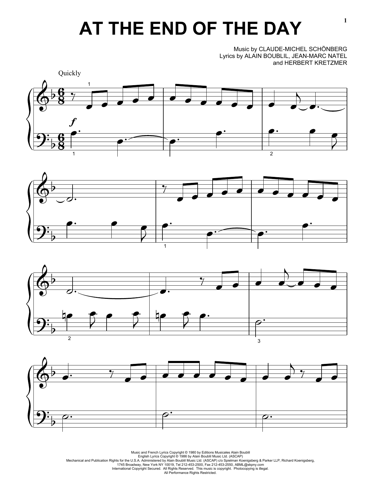 Download or print Claude-Michel Schonberg At The End Of The Day sheet music, chords and digital score arranged for Beginning Piano Solo. This Musical/Show score includes 5 page(s).