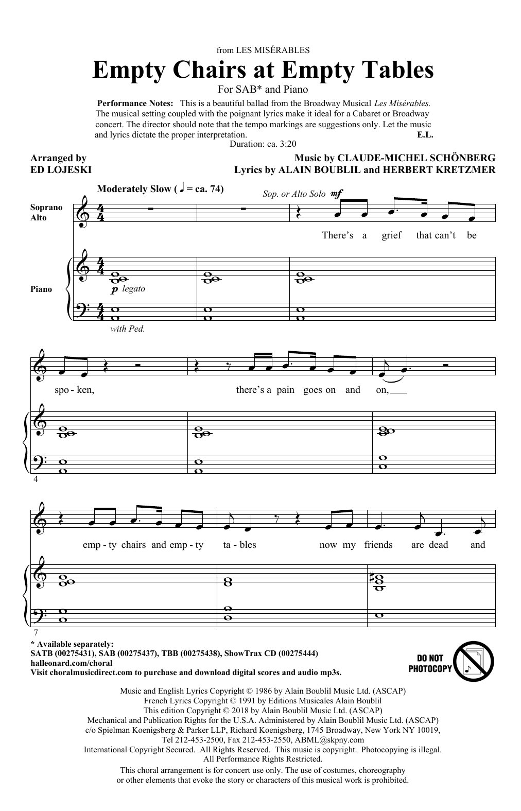 Download or print Boublil and Schonberg Empty Chairs At Empty Tables (from Les Miserables) (arr. Ed Lojeski) sheet music, chords and digital score arranged for TBB Choir. This Musical/Show score includes 7 page(s).