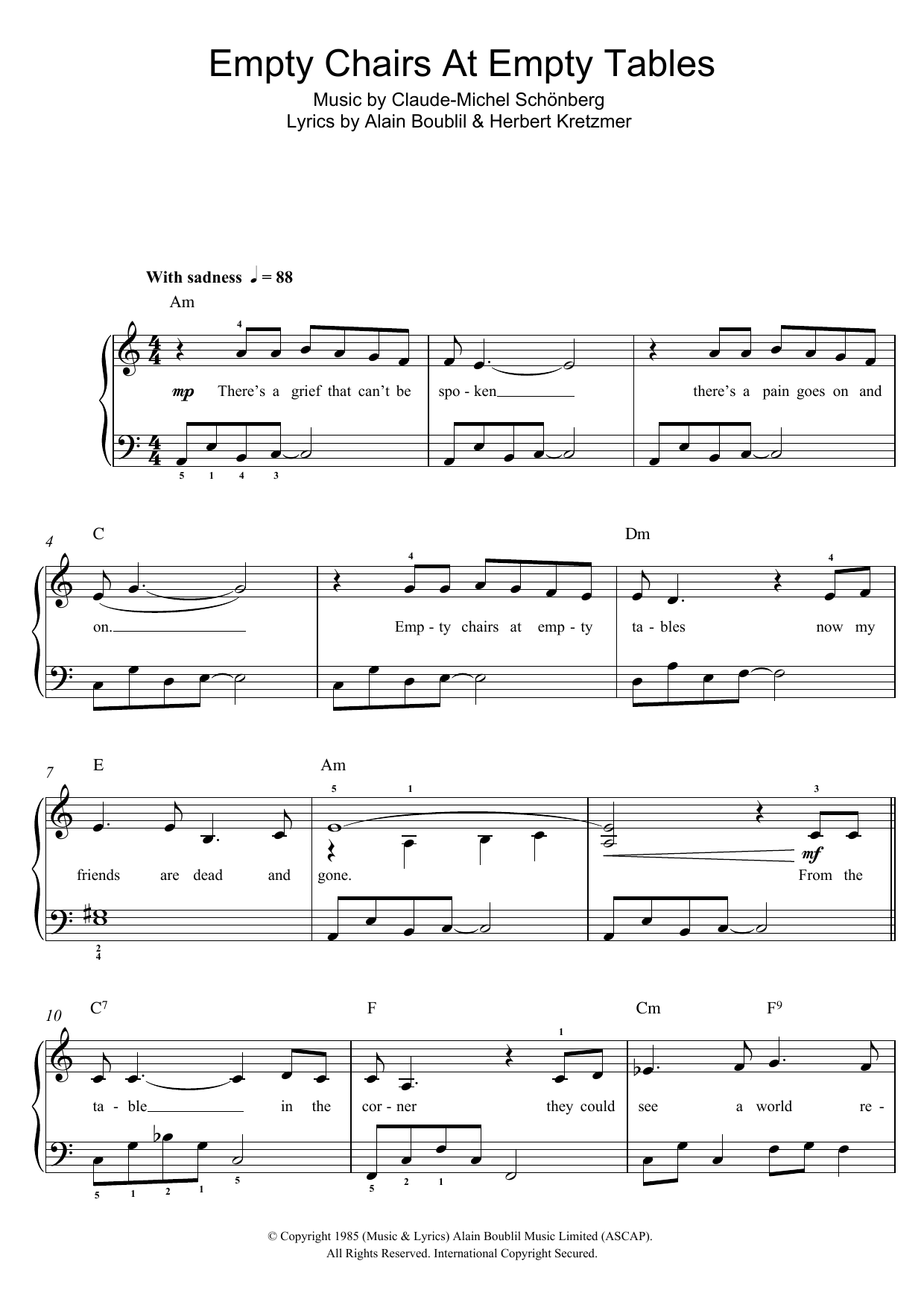 Download or print Boublil and Schonberg Empty Chairs At Empty Tables (from Les Miserables) sheet music, chords and digital score arranged for Piano & Vocal. This Broadway score includes 4 page(s).