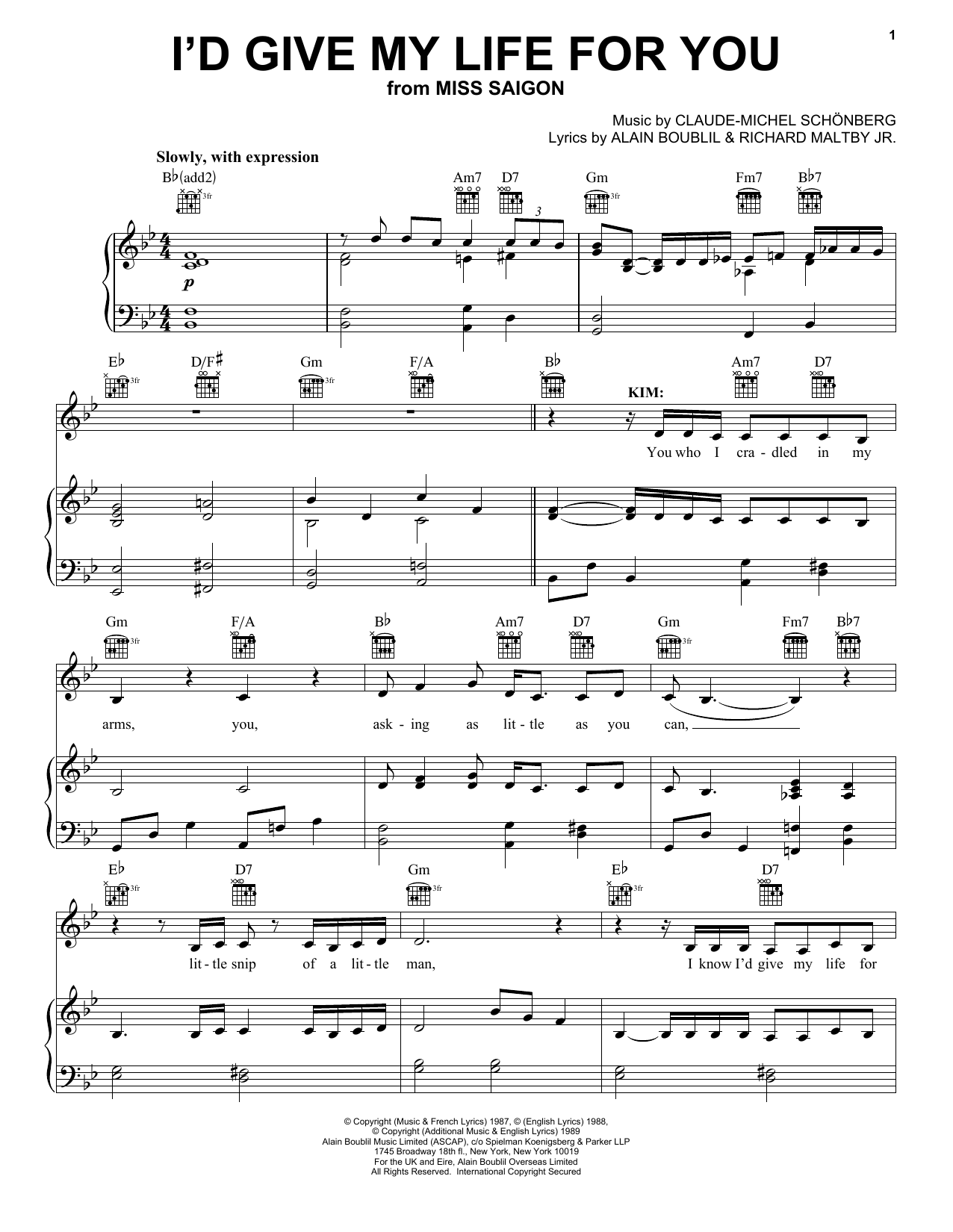 Download or print Boublil and Schonberg I'd Give My Life For You (from Miss Saigon) sheet music, chords and digital score arranged for Piano & Vocal. This Musical/Show score includes 6 page(s).