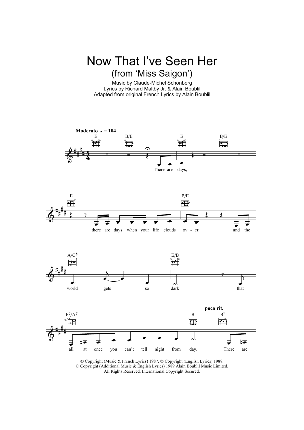 Download or print Claude-Michel Schonberg Now That I've Seen Her (from Miss Saigon) sheet music, chords and digital score arranged for Lead Sheet / Fake Book. This Musical/Show score includes 4 page(s).