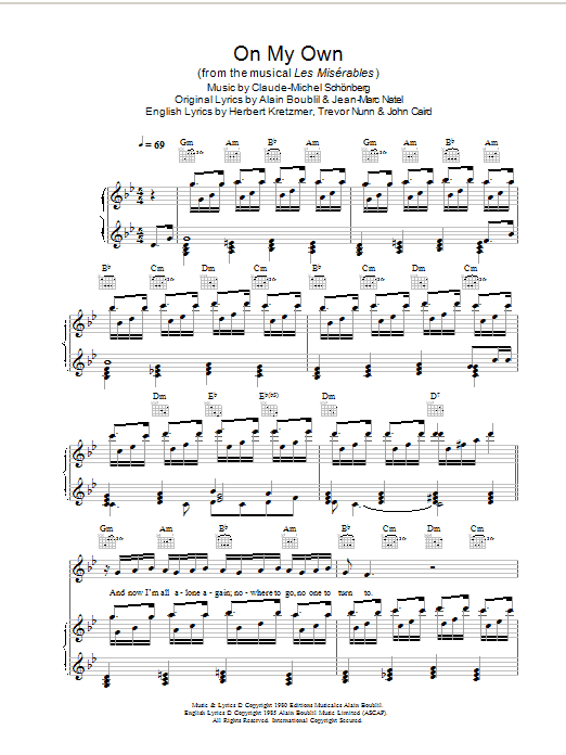 Download or print Alain Boublil On My Own (from Les Miserables) sheet music, chords and digital score arranged for Piano Solo. This Musical/Show score includes 3 page(s).