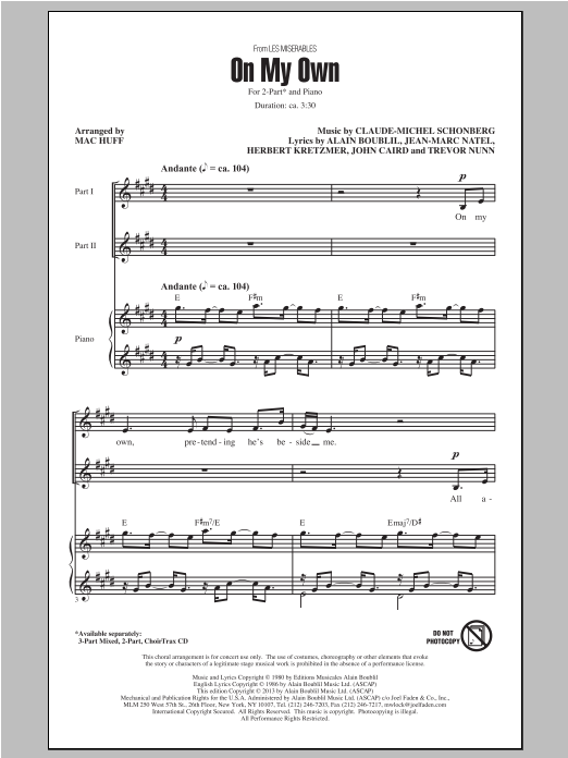 Download or print Boublil and Schonberg On My Own (from Les Miserables) (arr. Mac Huff) sheet music, chords and digital score arranged for 3-Part Mixed Choir. This Broadway score includes 5 page(s).