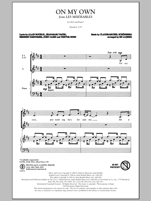 Download or print Boublil and Schonberg On My Own (from Les Miserables) (arr. Ed Lojeski) sheet music, chords and digital score arranged for SSA Choir. This Broadway score includes 8 page(s).