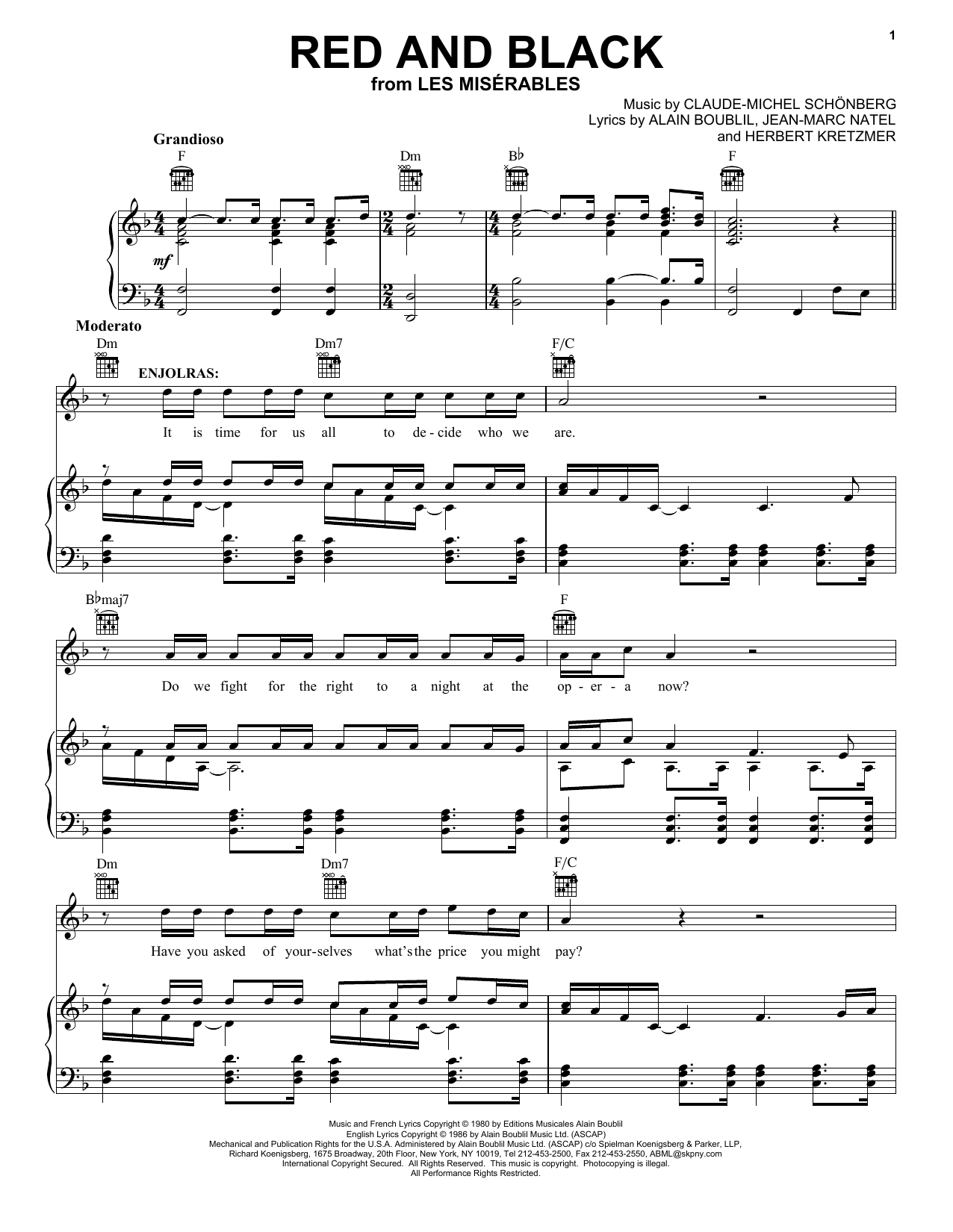 Download or print Alain Boublil Red And Black sheet music, chords and digital score arranged for Piano, Vocal & Guitar Chords (Right-Hand Melody). This Musical/Show score includes 5 page(s).