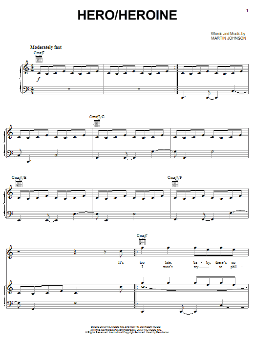 Download or print Boys Like Girls Hero/Heroine sheet music, chords and digital score arranged for Piano, Vocal & Guitar Chords (Right-Hand Melody). This Pop score includes 9 page(s).