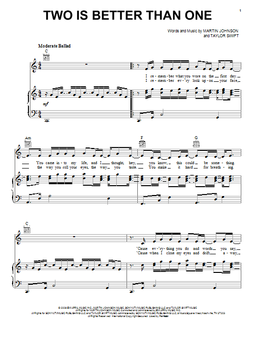 Download or print Boys Like Girls featuring Taylor Swift Two Is Better Than One sheet music, chords and digital score arranged for Piano, Vocal & Guitar Chords (Right-Hand Melody). This Country score includes 5 page(s).
