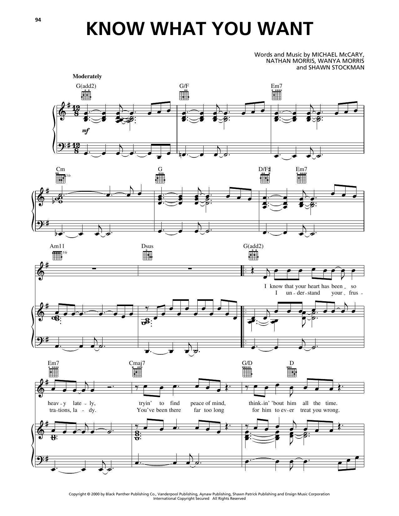 Download or print Boyz II Men Know What You Want sheet music, chords and digital score arranged for Piano, Vocal & Guitar Chords (Right-Hand Melody). This Pop score includes 6 page(s).