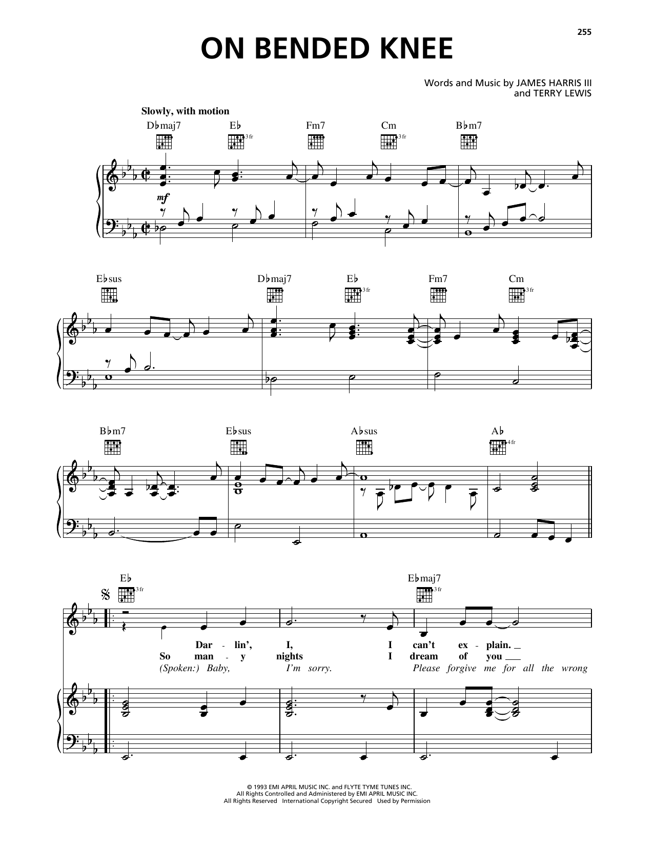 Download or print Boyz II Men On Bended Knee sheet music, chords and digital score arranged for Piano, Vocal & Guitar Chords (Right-Hand Melody). This Pop score includes 9 page(s).
