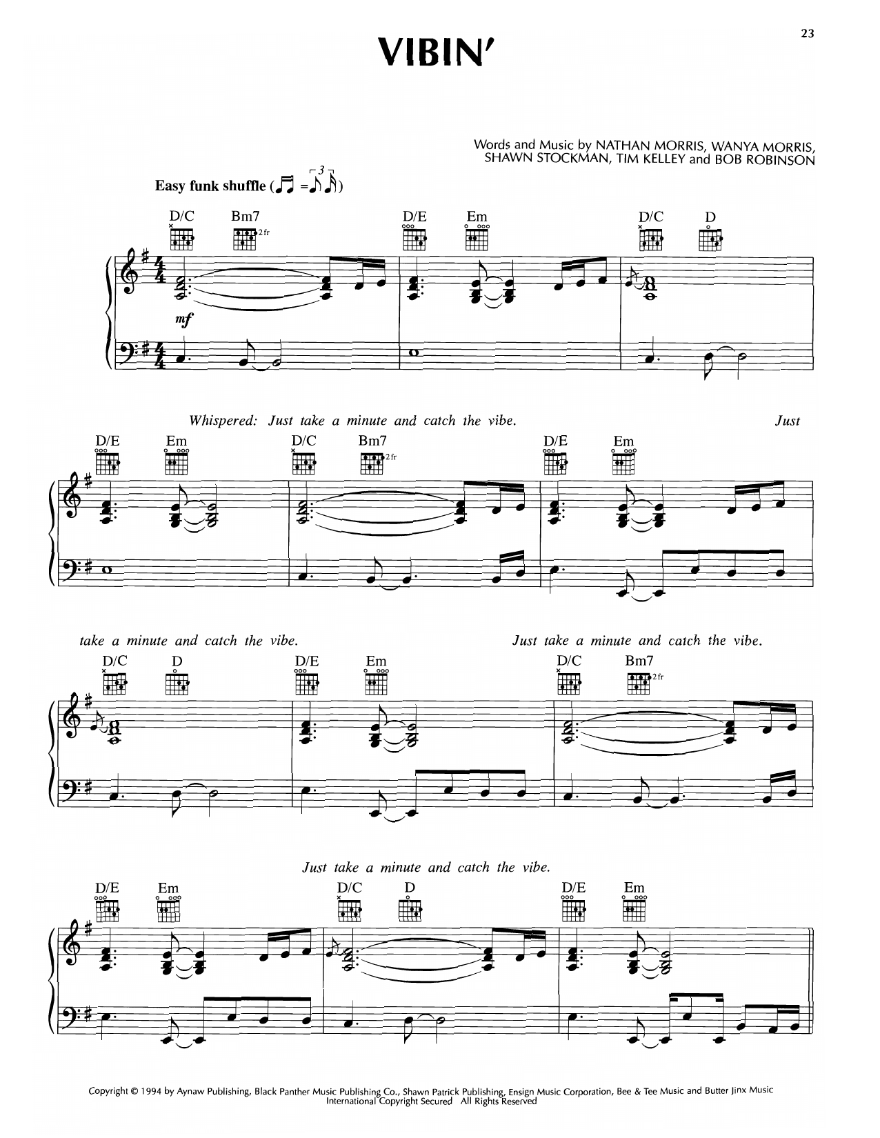 Download or print Boyz II Men Vibin' sheet music, chords and digital score arranged for Piano, Vocal & Guitar Chords (Right-Hand Melody). This Pop score includes 5 page(s).