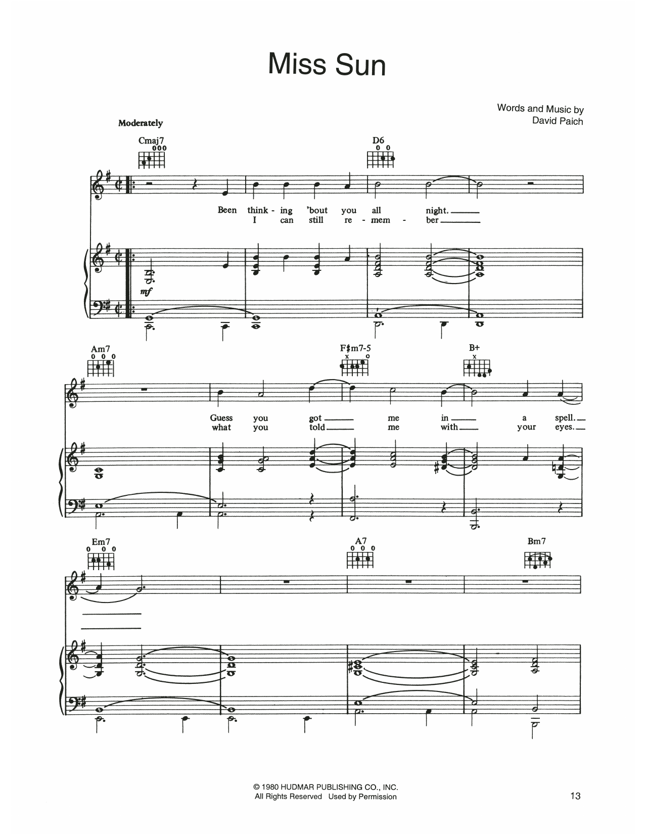 Download or print Boz Scaggs Miss Sun sheet music, chords and digital score arranged for Piano, Vocal & Guitar Chords (Right-Hand Melody). This Pop score includes 3 page(s).