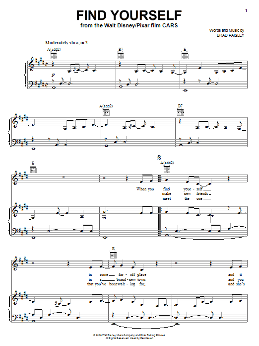 Download or print Brad Paisley Find Yourself (from Cars) sheet music, chords and digital score arranged for Easy Piano. This Children score includes 6 page(s).