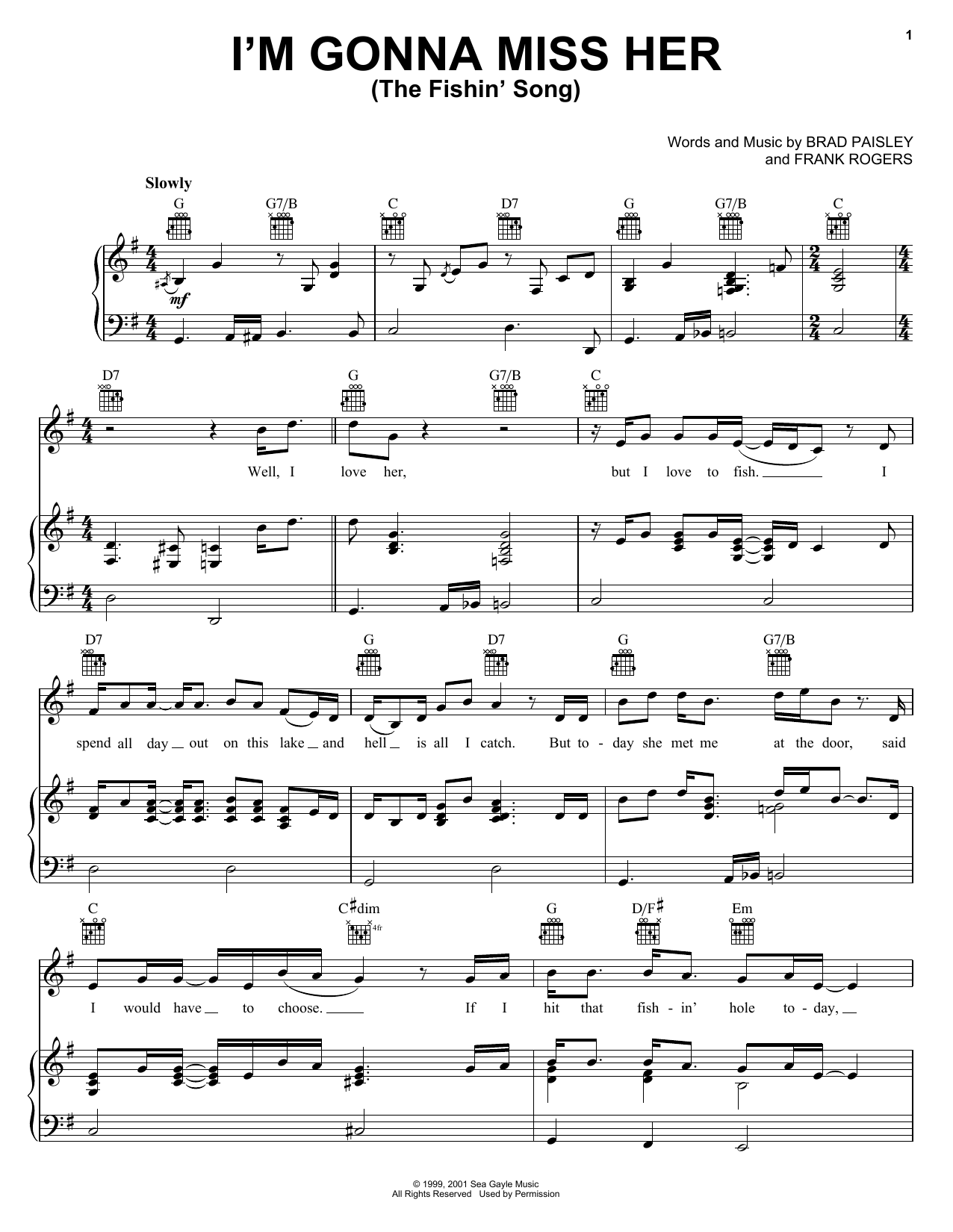 Download or print Brad Paisley I'm Gonna Miss Her (The Fishin' Song) sheet music, chords and digital score arranged for Guitar Tab. This Country score includes 14 page(s).