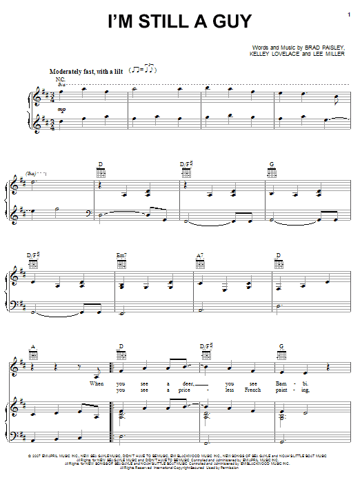 Download or print Brad Paisley I'm Still A Guy sheet music, chords and digital score arranged for Piano, Vocal & Guitar Chords (Right-Hand Melody). This Country score includes 10 page(s).