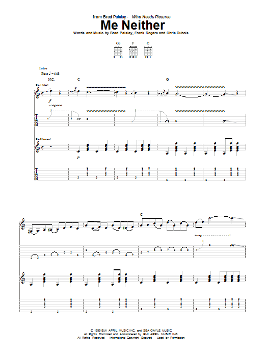 Download or print Brad Paisley Me Neither sheet music, chords and digital score arranged for Guitar Tab. This Country score includes 12 page(s).