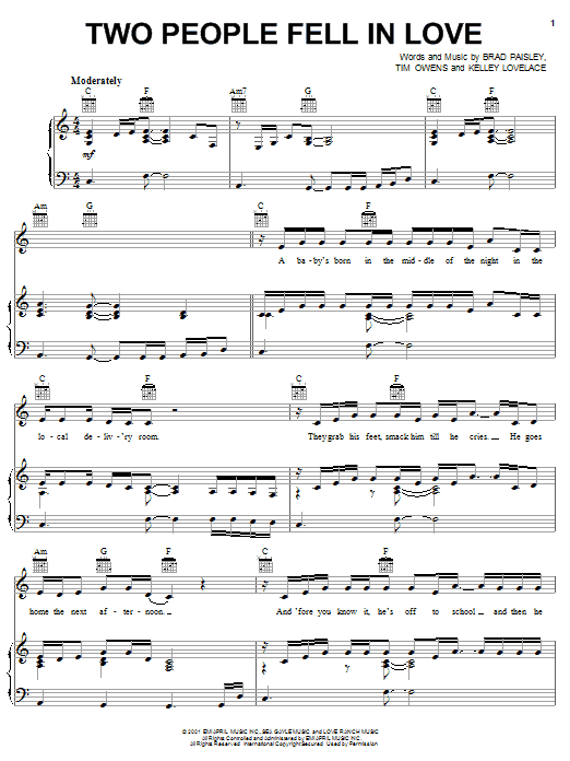 Download or print Brad Paisley Two People Fell In Love sheet music, chords and digital score arranged for Piano, Vocal & Guitar Chords (Right-Hand Melody). This Country score includes 9 page(s).