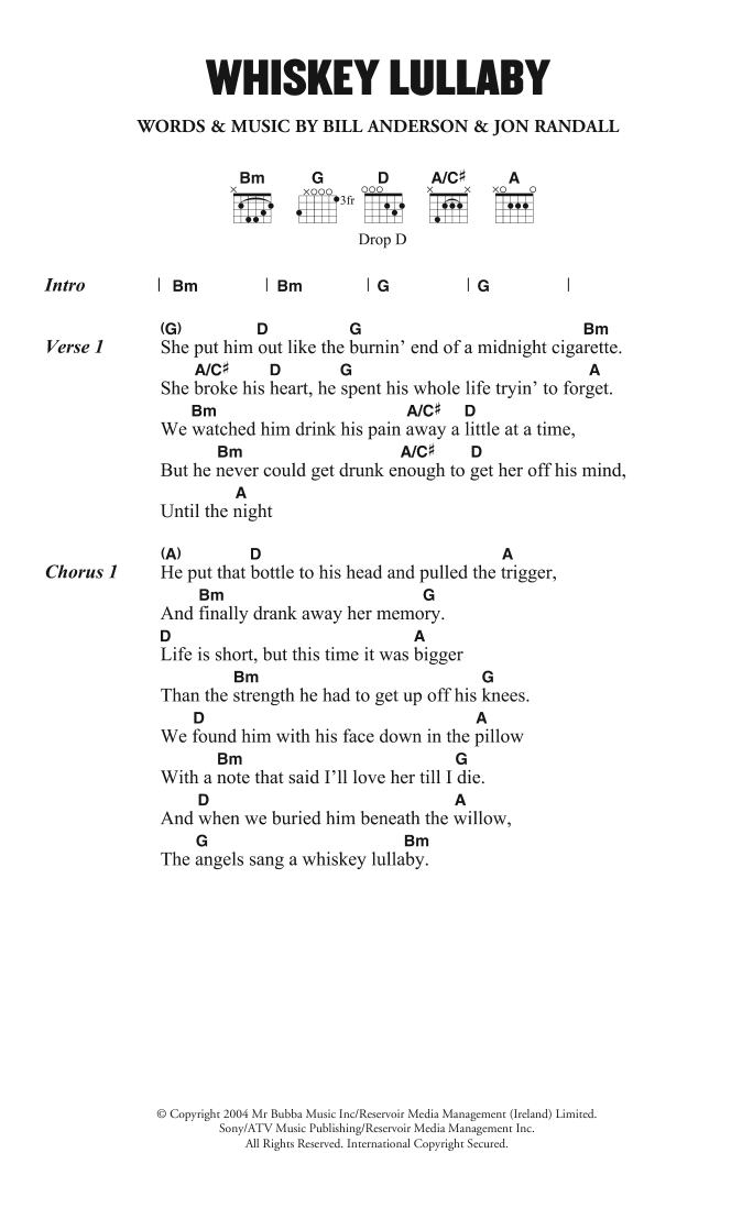 Download or print Brad Paisley Whiskey Lullaby (feat. Alison Krauss) sheet music, chords and digital score arranged for Guitar Chords/Lyrics. This Country score includes 2 page(s).