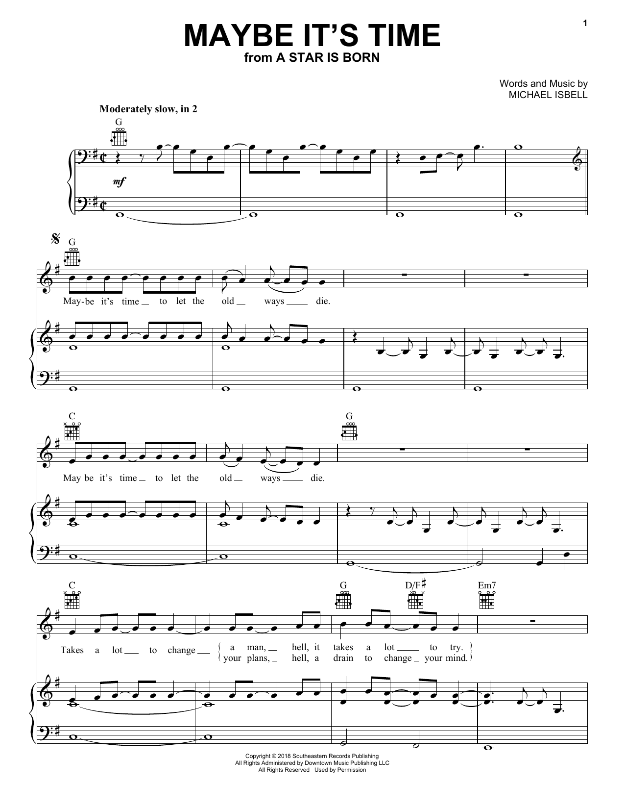 Download or print Bradley Cooper Maybe It's Time (from A Star Is Born) sheet music, chords and digital score arranged for Easy Piano. This Pop score includes 5 page(s).