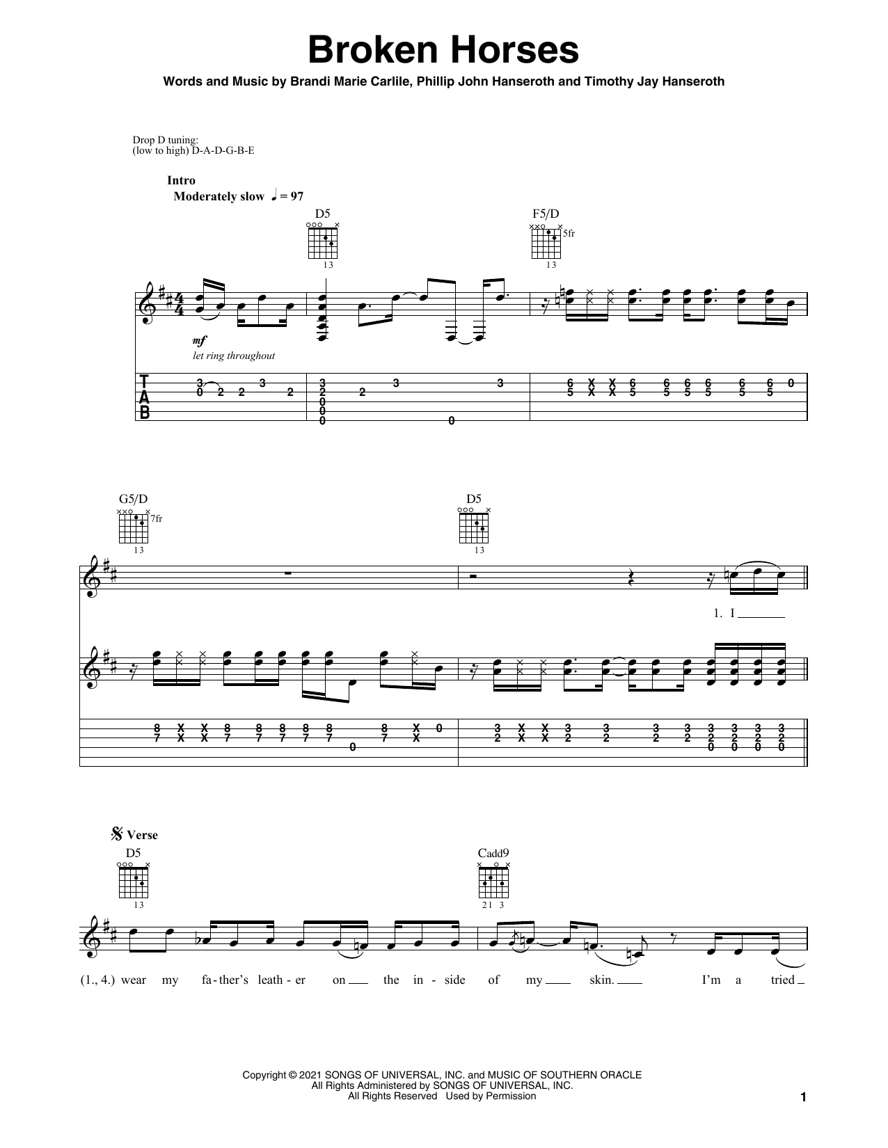 Download or print Brandi Carlile Broken Horses sheet music, chords and digital score arranged for Solo Guitar. This Pop score includes 5 page(s).