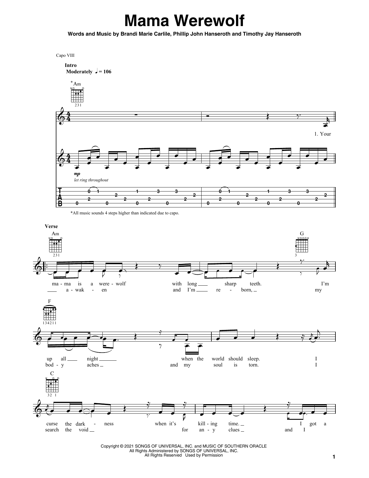 Download or print Brandi Carlile Mama Werewolf sheet music, chords and digital score arranged for Solo Guitar. This Pop score includes 4 page(s).