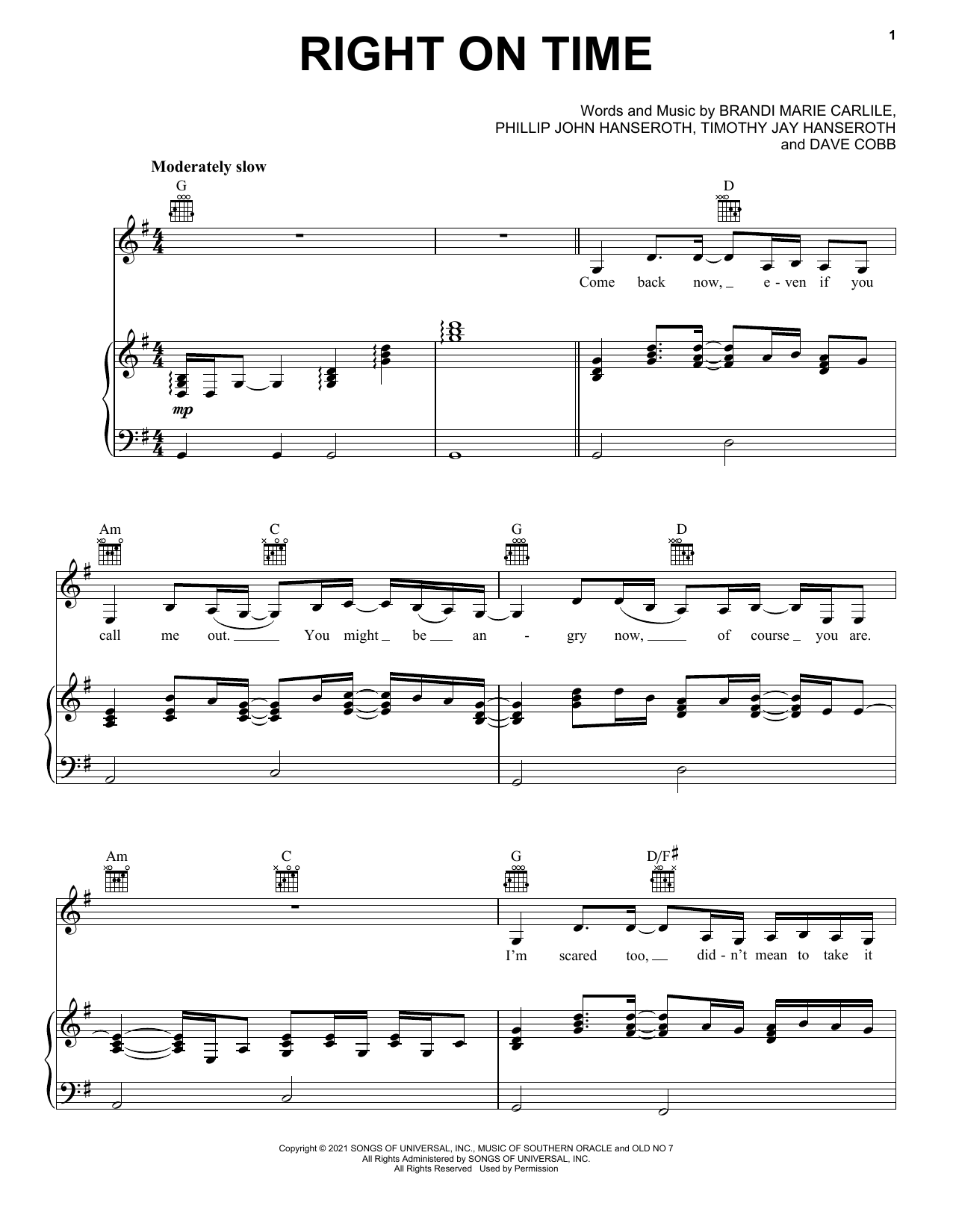 Download or print Brandi Carlile Right On Time sheet music, chords and digital score arranged for Piano, Vocal & Guitar Chords (Right-Hand Melody). This Pop score includes 5 page(s).