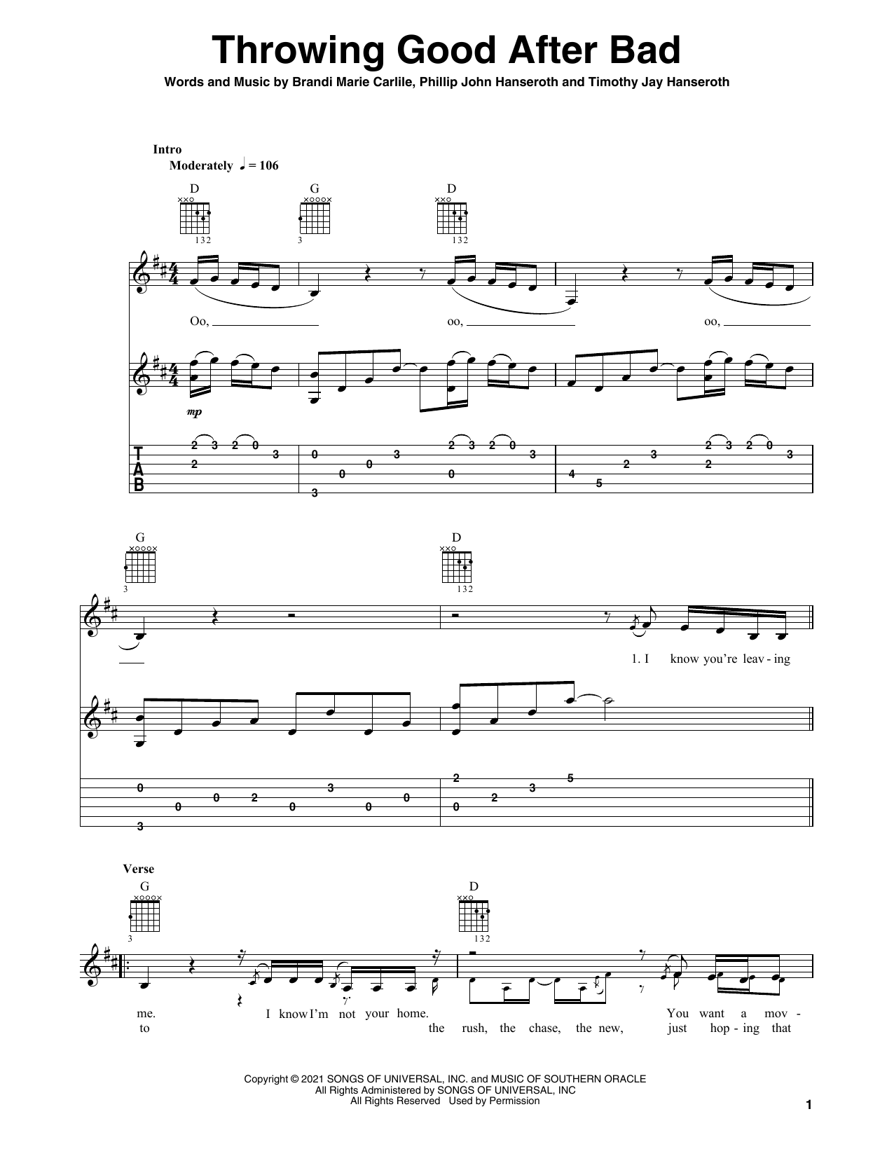 Download or print Brandi Carlile Throwing Good After Bad sheet music, chords and digital score arranged for Solo Guitar. This Pop score includes 5 page(s).