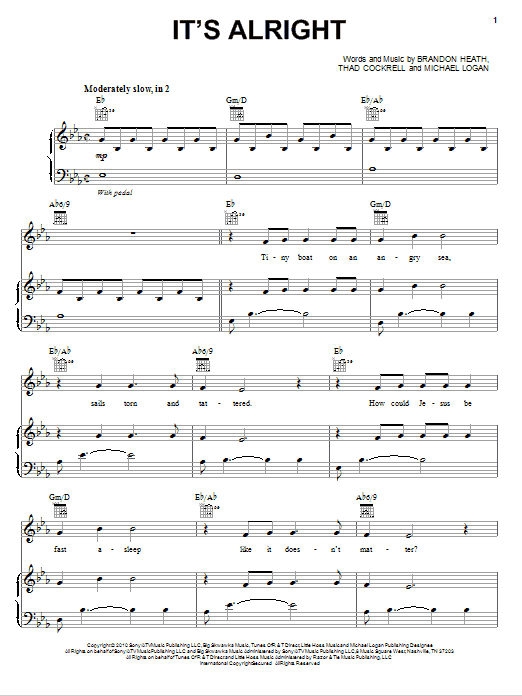 Download or print Brandon Heath It's Alright sheet music, chords and digital score arranged for Piano, Vocal & Guitar Chords (Right-Hand Melody). This Christian score includes 8 page(s).