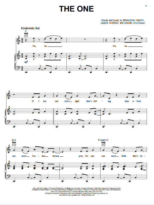 Download or print Brandon Heath The One sheet music, chords and digital score arranged for Piano, Vocal & Guitar Chords (Right-Hand Melody). This Christian score includes 9 page(s).