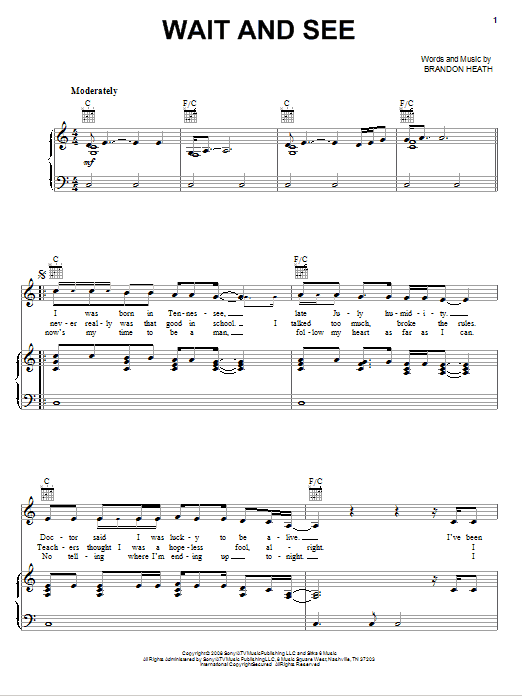 Download or print Brandon Heath Wait And See sheet music, chords and digital score arranged for Piano, Vocal & Guitar Chords (Right-Hand Melody). This Christian score includes 4 page(s).