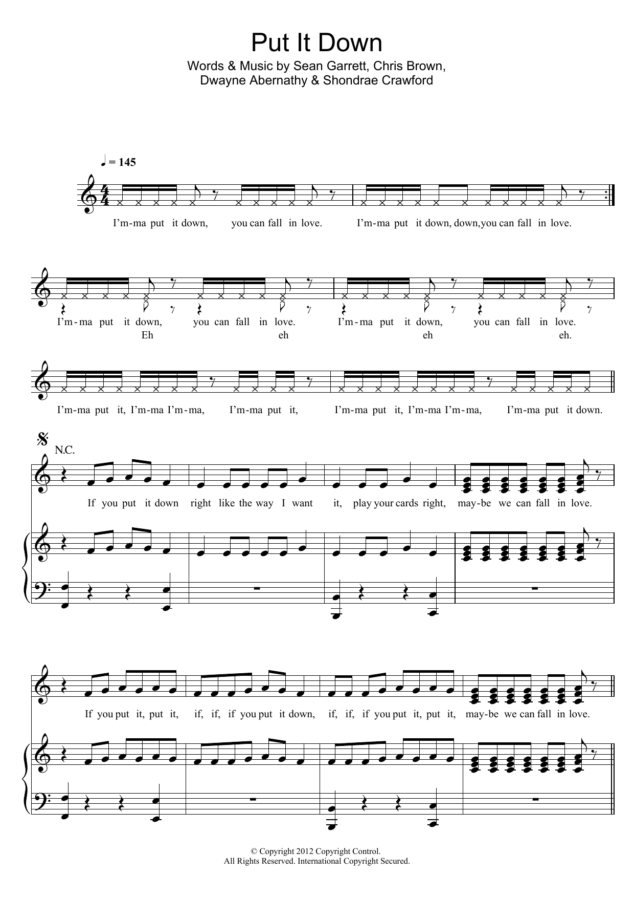 Download or print Brandy Put It Down (featuring Chris Brown) sheet music, chords and digital score arranged for Piano, Vocal & Guitar Chords. This Pop score includes 10 page(s).