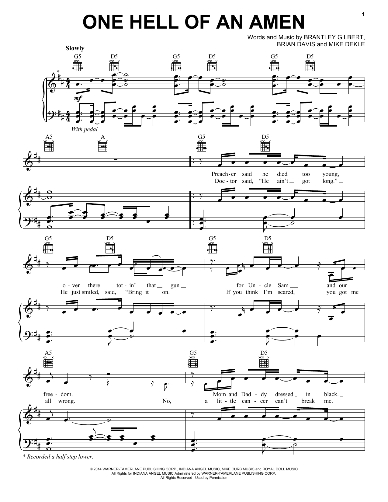 Download or print Brantley Gilbert One Hell Of An Amen sheet music, chords and digital score arranged for Piano, Vocal & Guitar Chords (Right-Hand Melody). This Pop score includes 5 page(s).