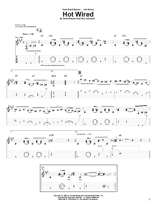 Download or print Brent Mason Hot Wired sheet music, chords and digital score arranged for Guitar Tab. This Rock score includes 9 page(s).