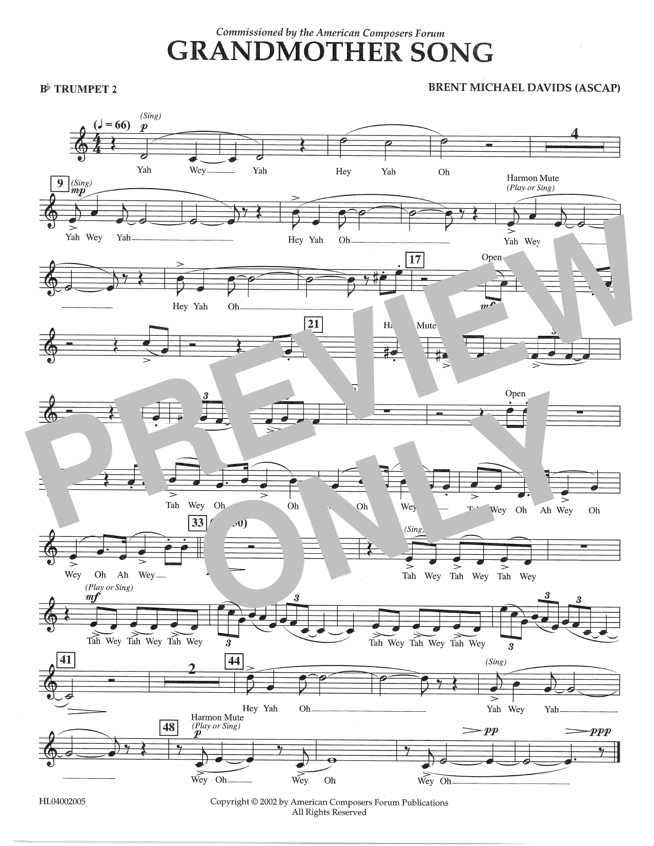 Download or print Brent Michael Davids Grandmother Song - Bb Trumpet 2 sheet music, chords and digital score arranged for Concert Band. This Concert score includes 1 page(s).