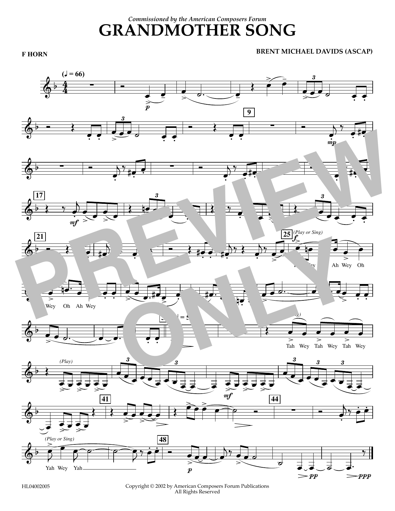 Download or print Brent Michael Davids Grandmother Song - F Horn sheet music, chords and digital score arranged for Concert Band. This Concert score includes 1 page(s).