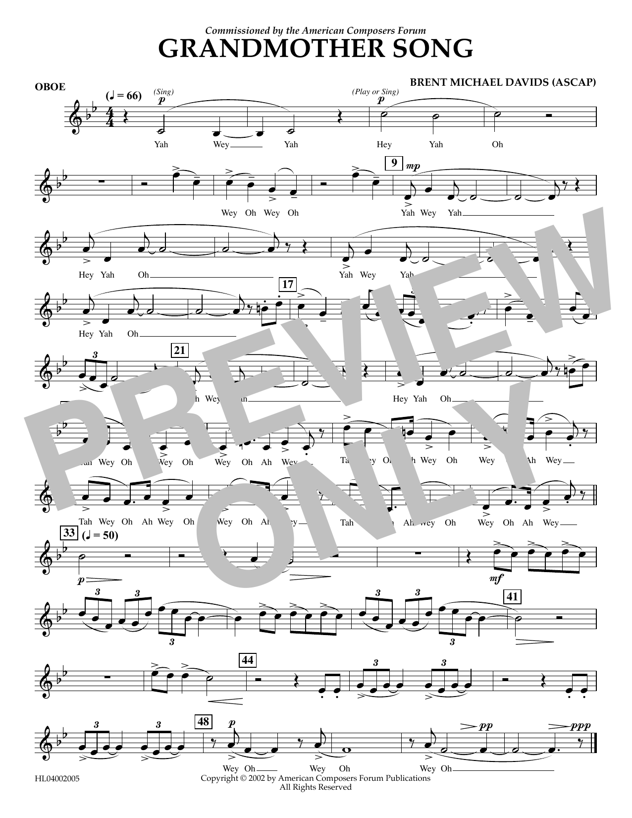Download or print Brent Michael Davids Grandmother Song - Oboe sheet music, chords and digital score arranged for Concert Band. This Concert score includes 1 page(s).