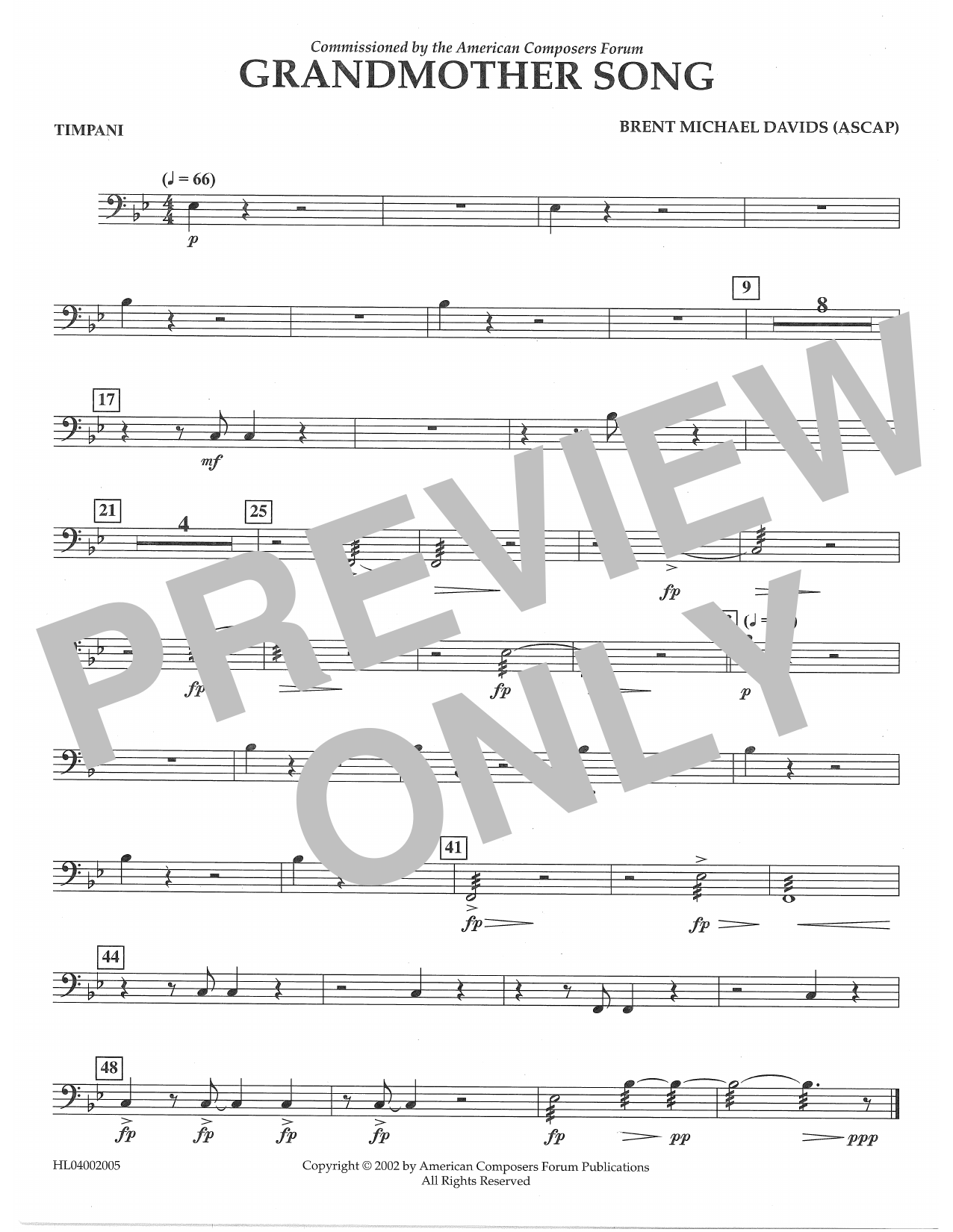 Download or print Brent Michael Davids Grandmother Song - Timpani sheet music, chords and digital score arranged for Concert Band. This Concert score includes 1 page(s).
