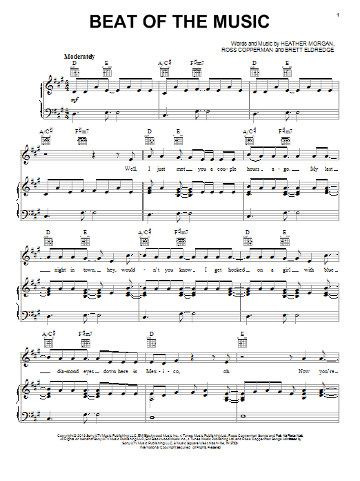 Download or print Brett Eldredge Beat Of The Music sheet music, chords and digital score arranged for Piano, Vocal & Guitar Chords (Right-Hand Melody). This Country score includes 6 page(s).