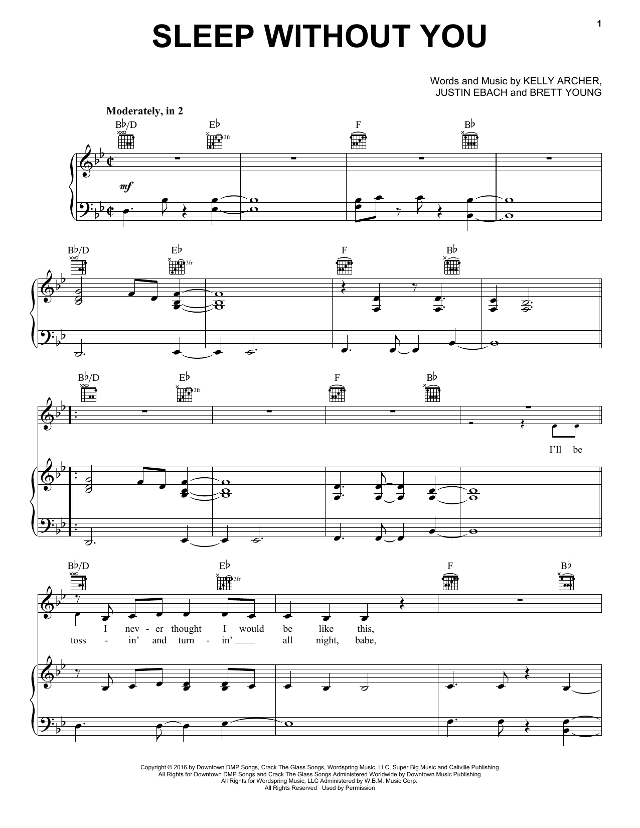 Download or print Brett Young Sleep Without You sheet music, chords and digital score arranged for Piano, Vocal & Guitar Chords (Right-Hand Melody). This Country score includes 7 page(s).