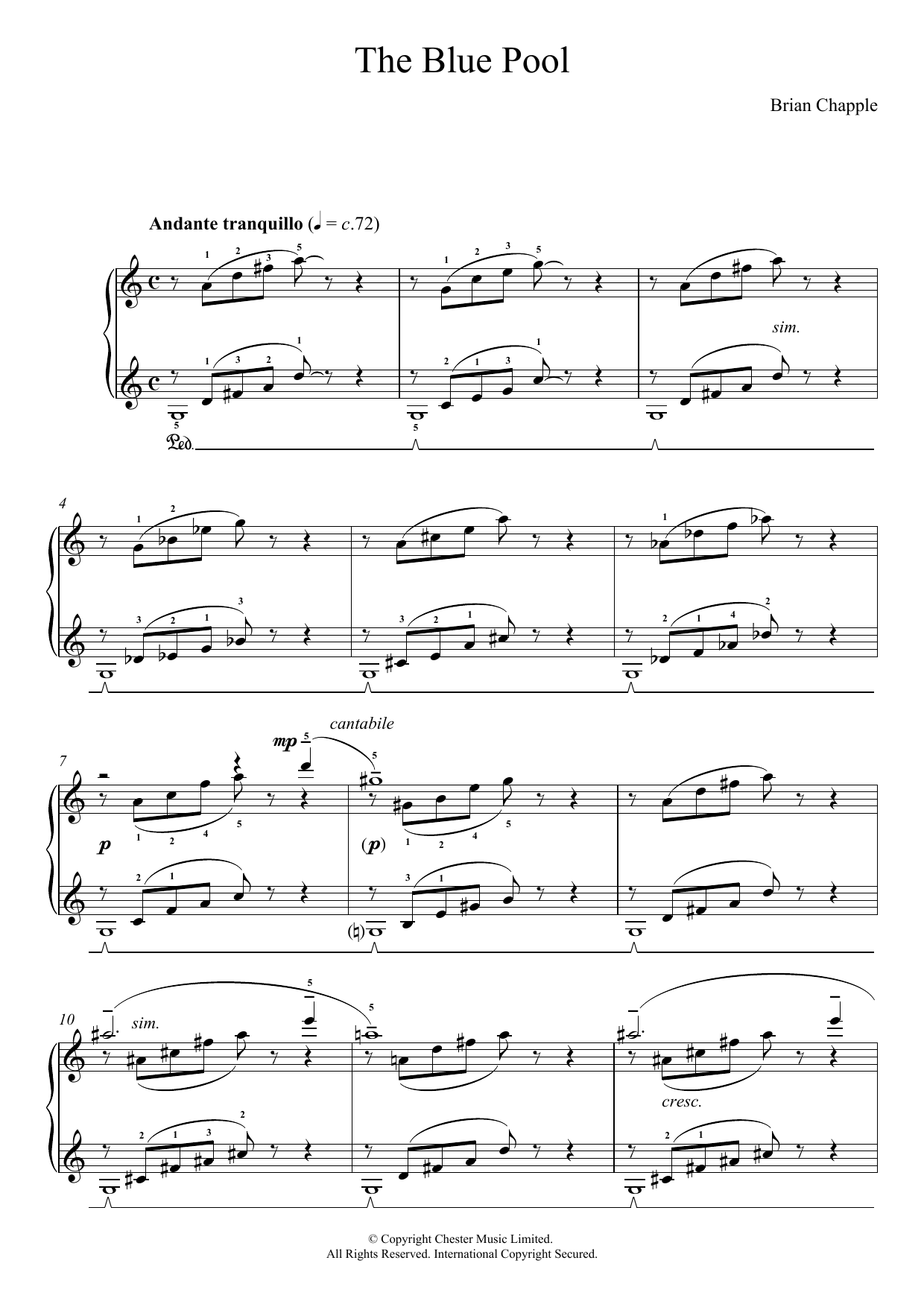 Download or print Brian Chapple The Blue Pool sheet music, chords and digital score arranged for Piano Solo. This Classical score includes 2 page(s).