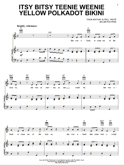 Download or print Brian Hyland Itsy Bitsy Teenie Weenie Yellow Polkadot Bikini sheet music, chords and digital score arranged for Piano, Vocal & Guitar Chords (Right-Hand Melody). This Oldies score includes 4 page(s).