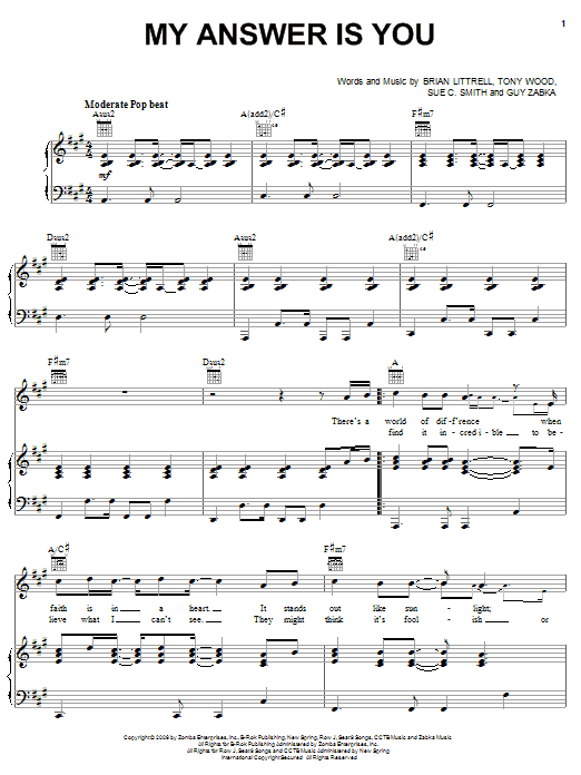 Download or print Brian Littrell My Answer Is You sheet music, chords and digital score arranged for Piano, Vocal & Guitar Chords (Right-Hand Melody). This Christian score includes 5 page(s).