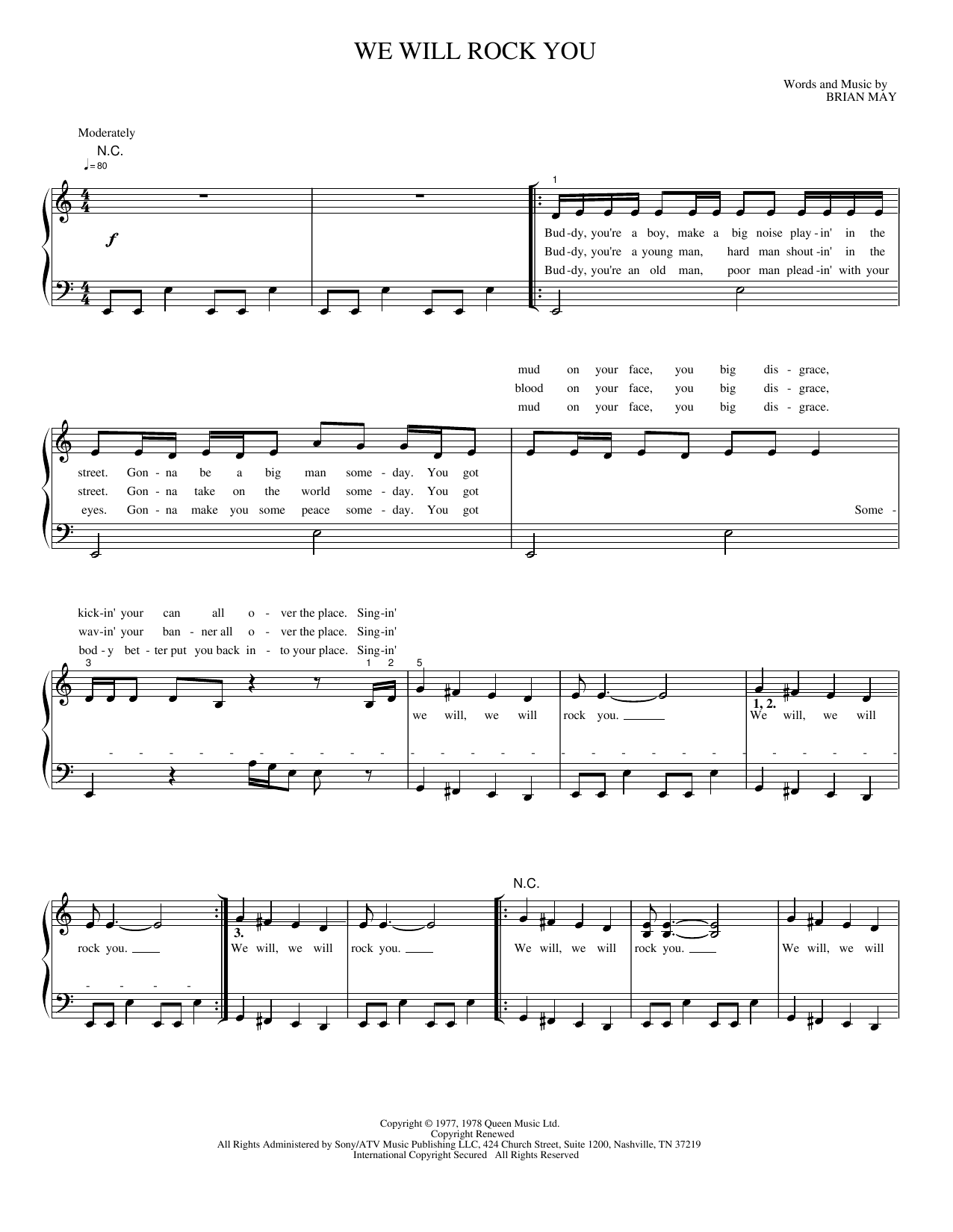 Download or print Brian May We Will Rock You sheet music, chords and digital score arranged for Piano, Vocal & Guitar Chords (Right-Hand Melody). This Rock score includes 2 page(s).