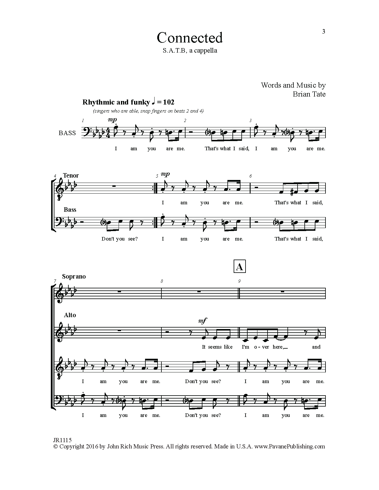 Download or print Brian Tate Connected sheet music, chords and digital score arranged for SAB Choir. This Concert score includes 8 page(s).